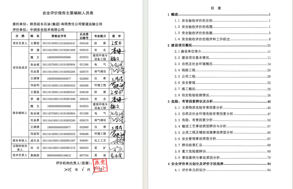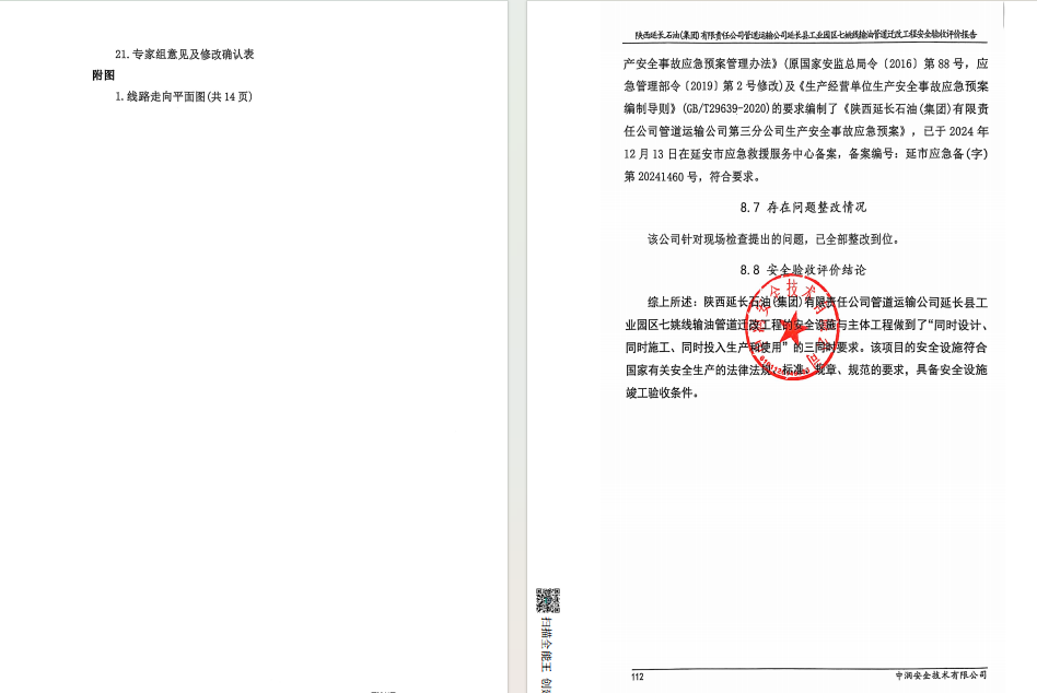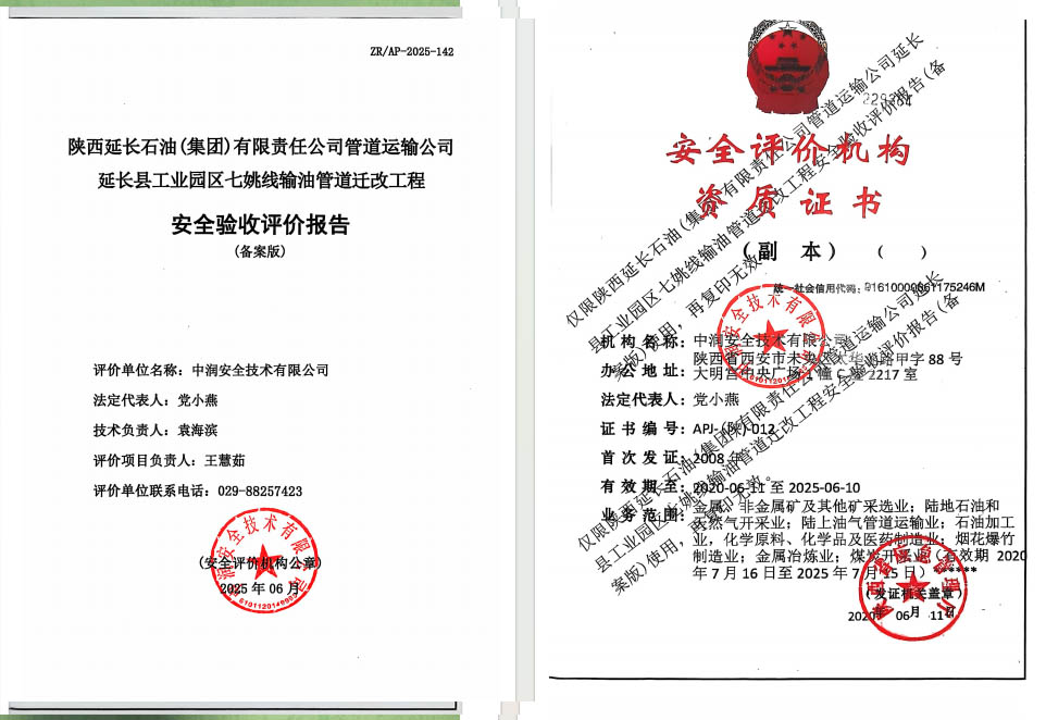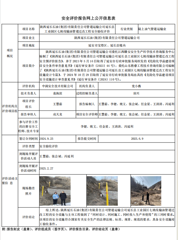 陕西延长石油(集团)有限责任公司管道运输公司延长县工业园区七姚线输油管道迁改工程安全验收评价