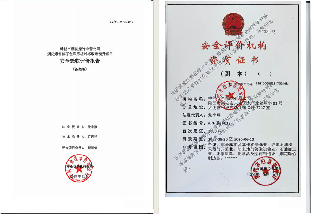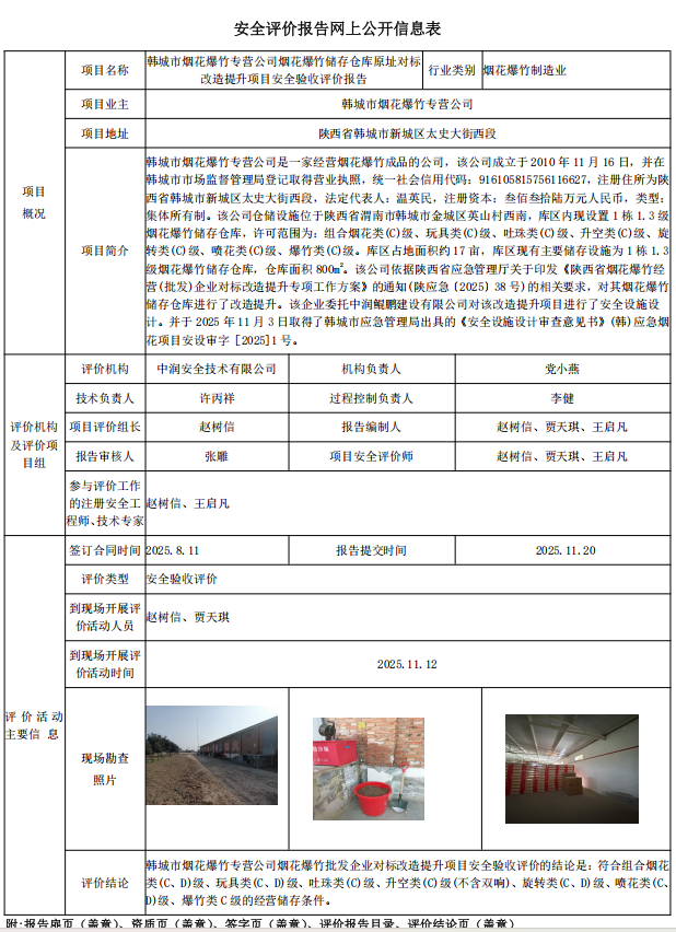 韩城市烟花爆竹专营公司 烟花爆竹储存仓库原址对标改造提升项目安全验收评价报告
