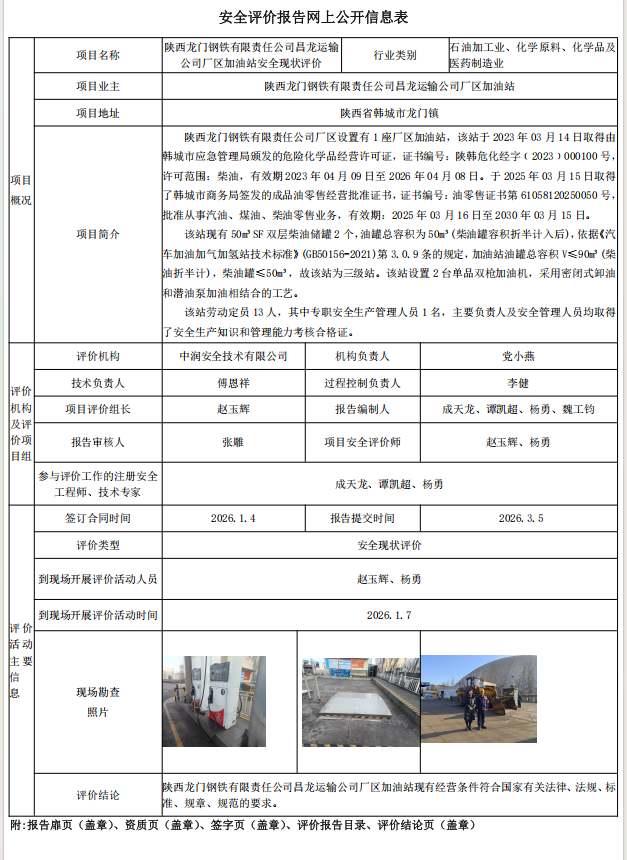 陕西龙门钢铁有限责任公司昌龙运输公司厂区加油站安全现状评价