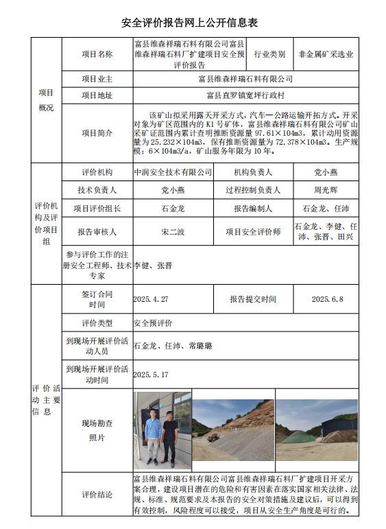 富县维森祥瑞石料有限公司富县维森祥瑞石料厂扩建项目安全预评价报告