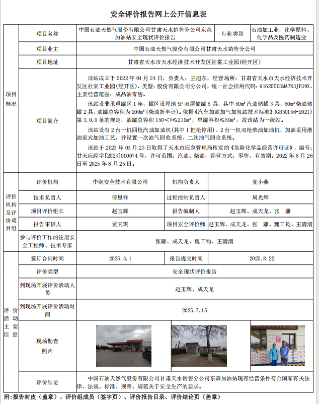中国石油天然气股份有限公司甘肃天水销售分公司东森加油站安全现状评价报告