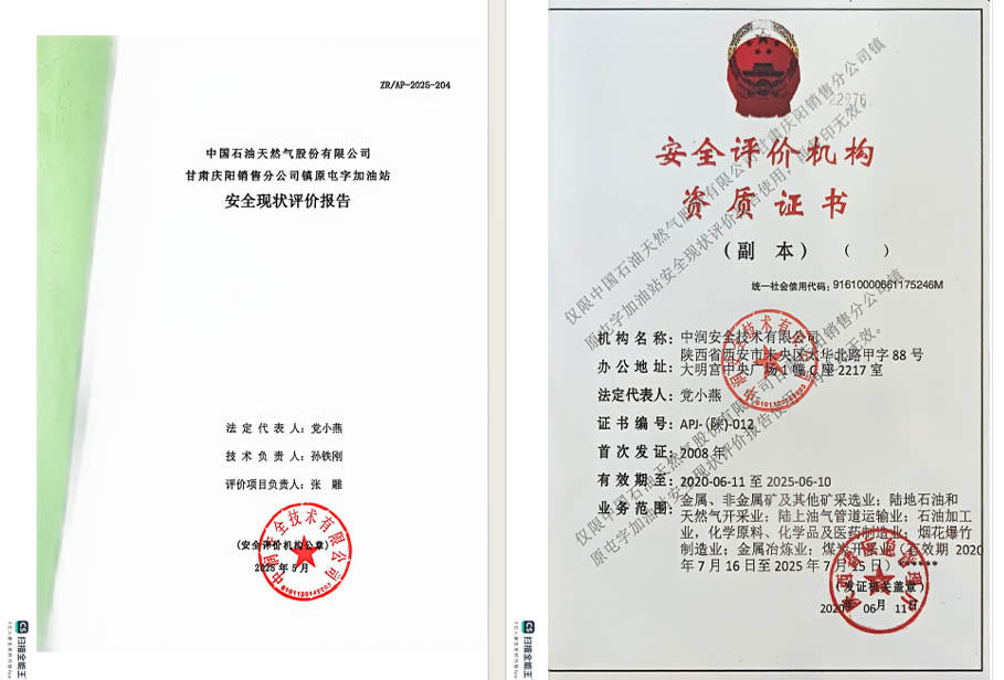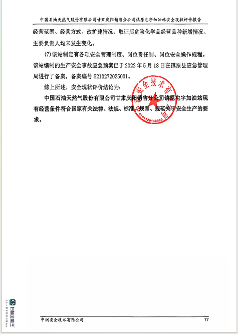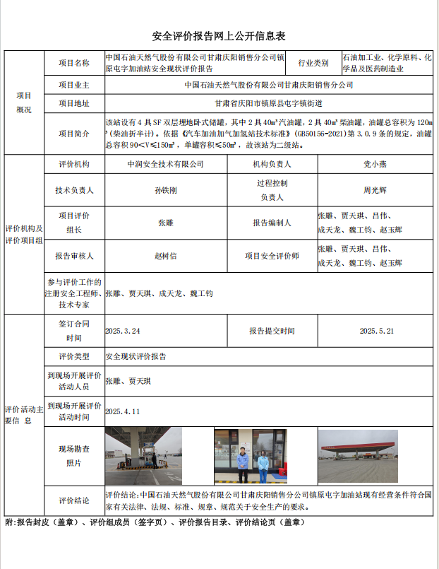 中国石油天然气股份有限公司甘肃庆阳销售分公司诚信加油站安全现状评价报告