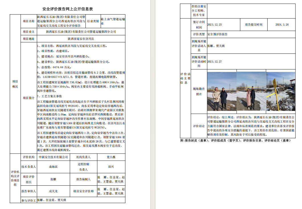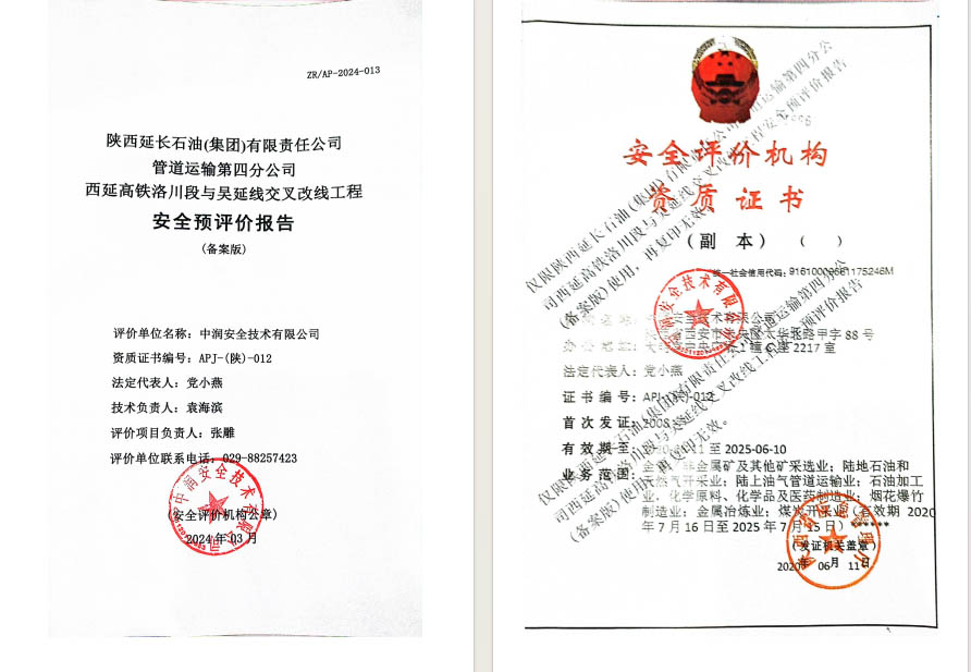 陕西延长石油(集团)有限责任公司管道运输第四分公司西延高铁洛川段与吴延线交叉改线工程安全评价报告